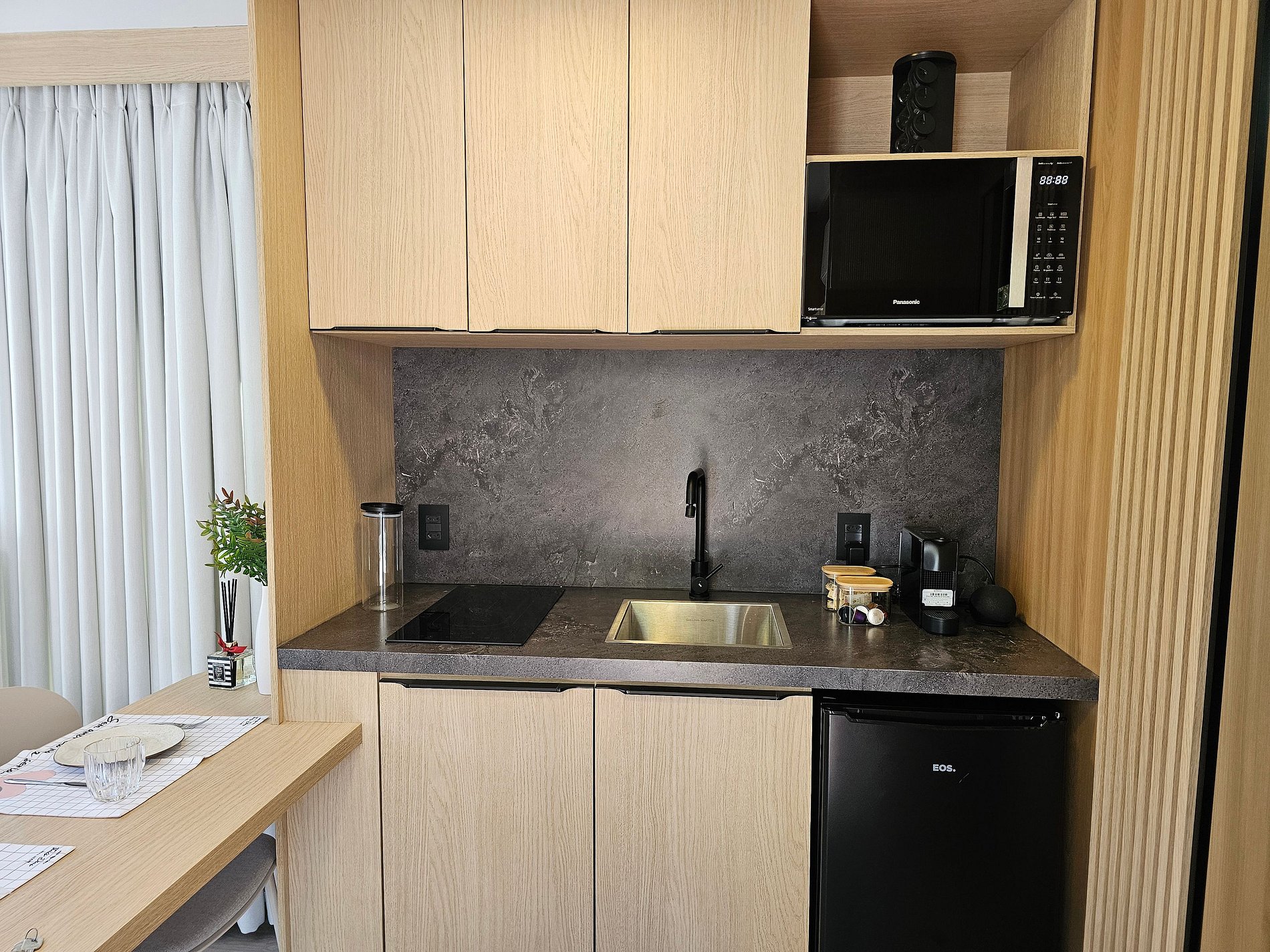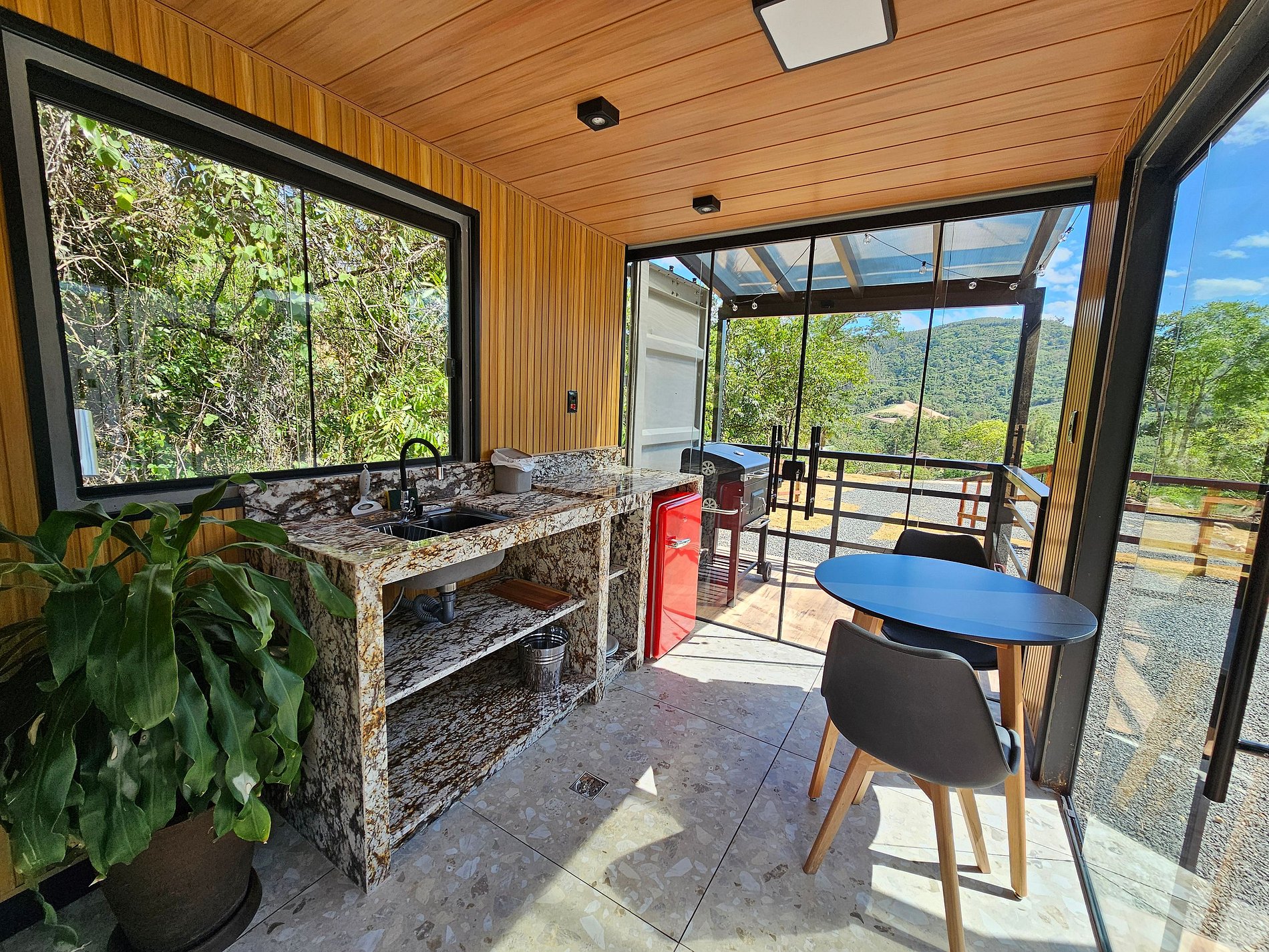 O espaço é totalmente mobiliado, contando com: Cama de casal, projetor de 84 polegadas, cozinha completa com cooktop, frigobar, micro-ondas, cafeteira Nespresso, utensílios, taças de vinho e espumante, canecas e aparelho de fondue. O banheiro possui ducha a gás bem quentinha, toalhas macias, secador de cabelo e amenities de cortesia.