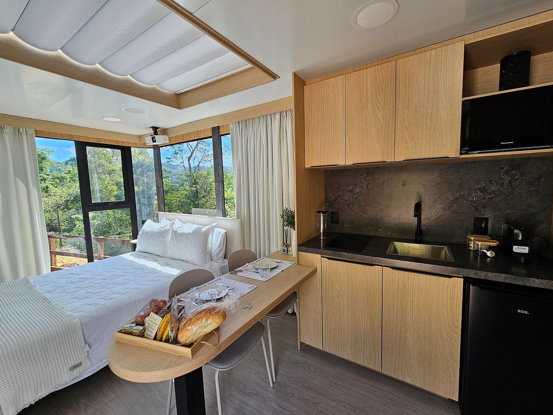 Com design moderno e ambiente aconchegante, a Cápsula foi planejada para oferecer conforto, estilo e privacidade em meio à natureza.