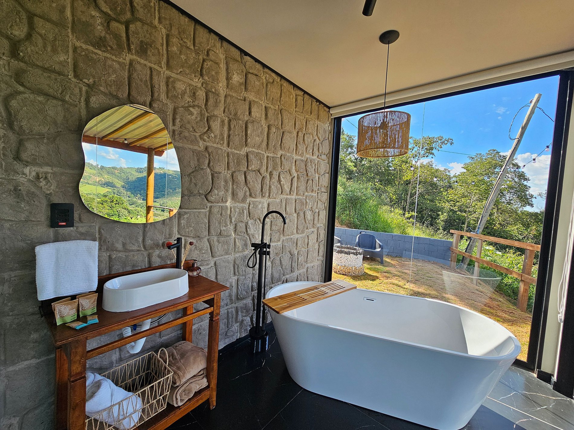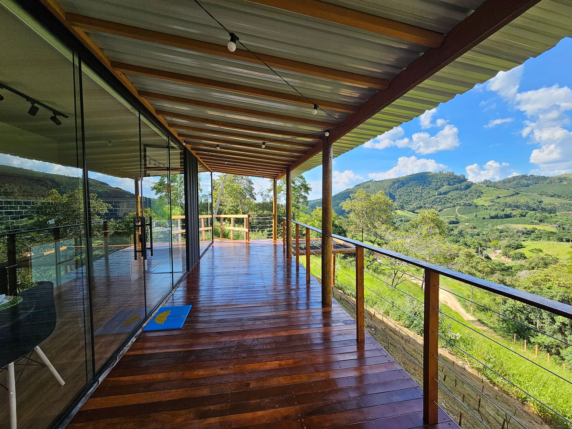 Projetado em container sustentável e com paredes de vidro, ele oferece uma vista panorâmica deslumbrante das montanhas de Serra Negra.