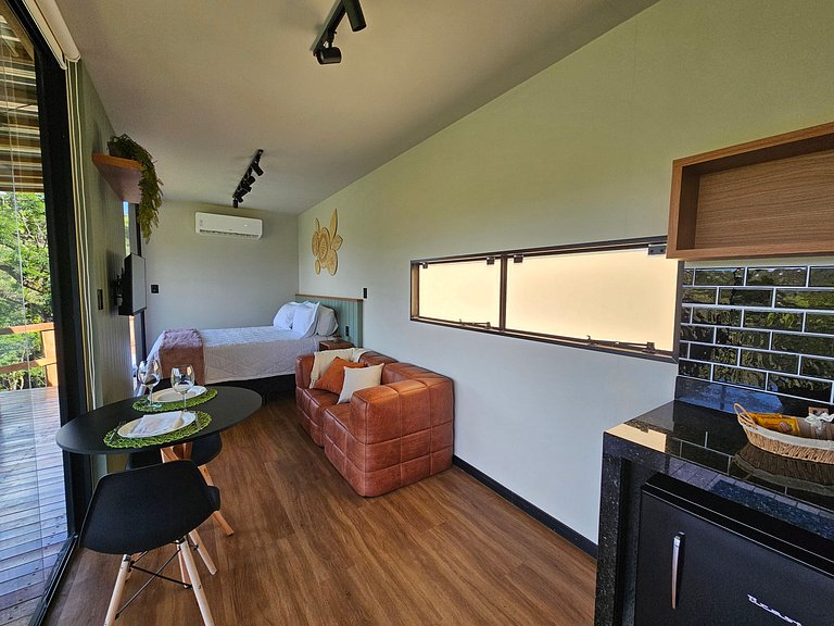 O Chalé Loft acomoda até 2 pessoas, possui cozinha completa com cooktop, air fryer e cafeteira Nespresso, uma sala charmosa com mesa de jantar, sofá e Smart TV, um banheiro espaçoso com ducha e uma incrível jacuzzi com vista para as montanhas e para completar ar condicionado para conforto em todas as estações