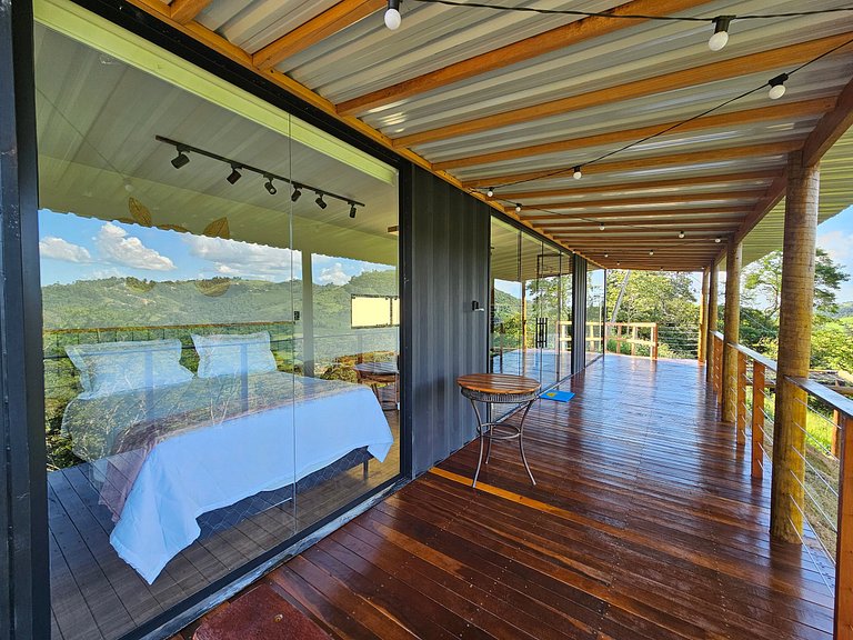 Projetado em container sustentável e com paredes de vidro, ele oferece uma vista panorâmica deslumbrante das montanhas de Serra Negra.